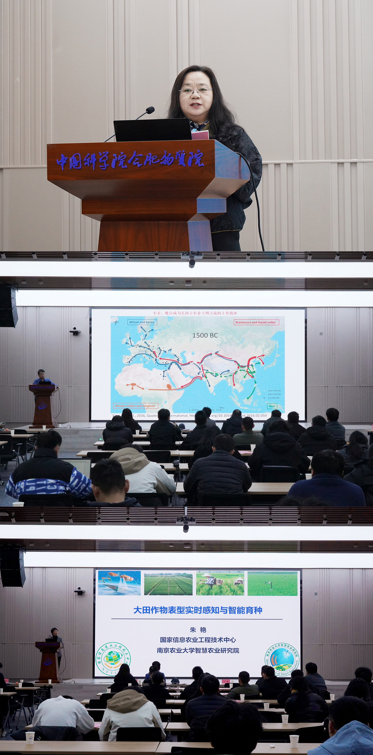(图一为吴丽芳主持论坛,图二、三分别为张学勇和朱艳在“2024中国智能育种创新技术研讨会”做报告)